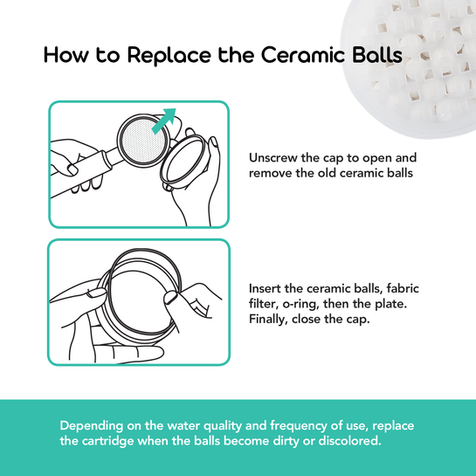 CLEAN AND HEALTHY SHOWERS The fabric filter for the Barumi® Livo Kids' Handheld Showerhead removes rust and small particles from tap water so your showers can be clean and refreshing. EASY INSTALLATION The fabric filter and ceramic balls for the Barumi® Livo Kids' Handheld Showerhead is super easy to replace with no tools needed! Simply unscrew, remove, and replace. 3-PACK Each package contains 3 fabric filters and 1 ceramic balls cartridge. WHEN TO REPLACE Simply replace the filters + ceramic balls once they become discolored. Do not reuse the ceramic balls.